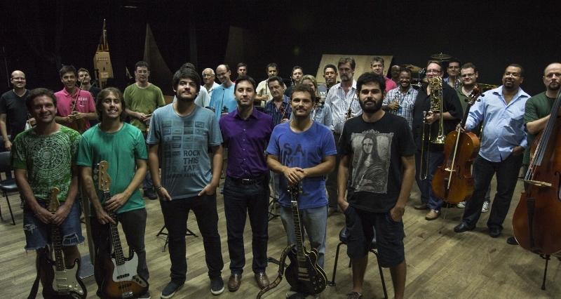 Orquestra Filarmônica da PUCRS e Banda Benjamin: André Leguisamo, Mauricio Dalla Zen, Mauricio Ataide, Márcio Buzatto (maestro), Guilherme Pirillo e Rafael Cazzeta. Foto: Helena Rocha