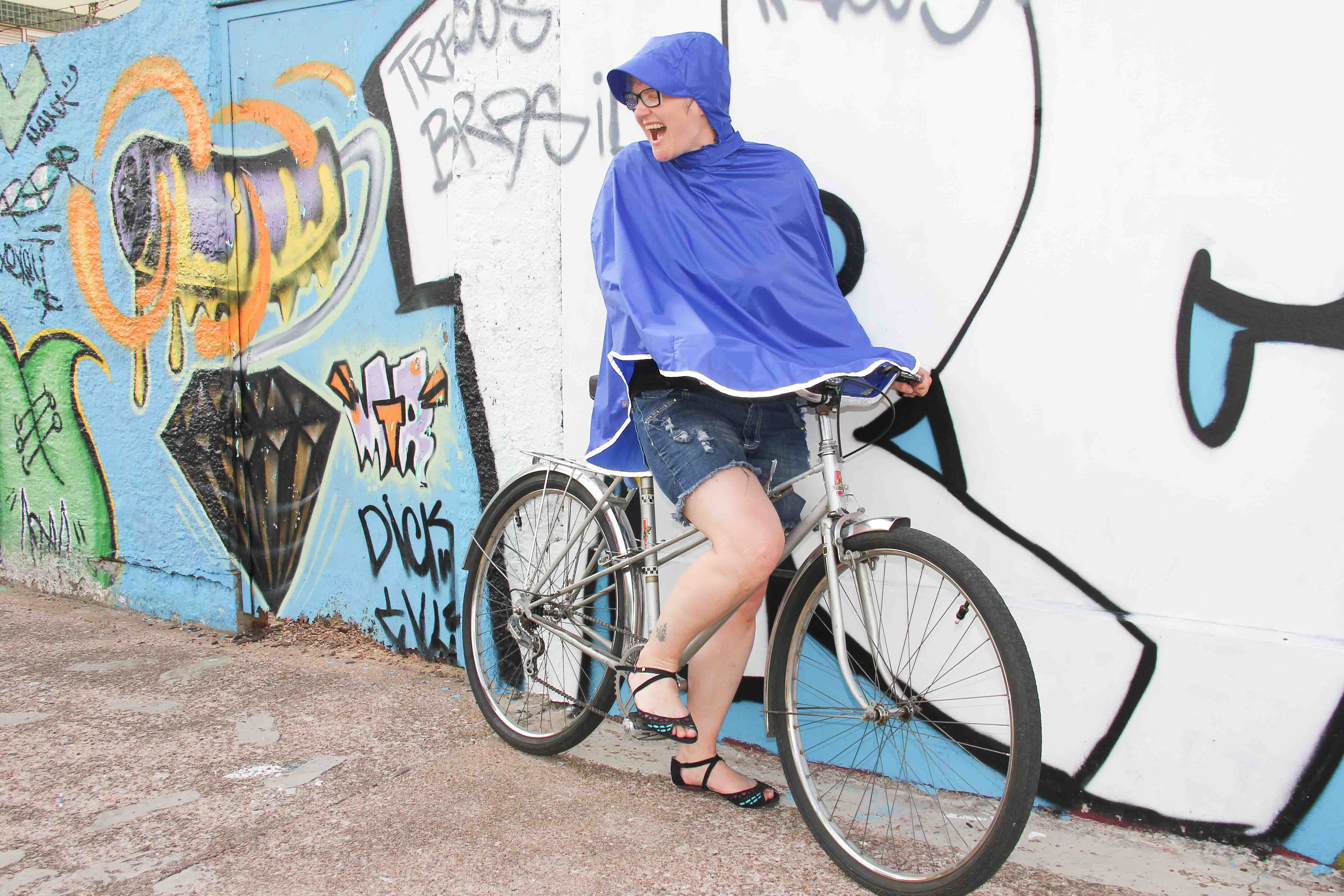 No caso da Bikedrops, produzida pela dupla Lívia Araújo e Marisa Dal Pizzol, a ideia foi de superar o “medo da chuva”: o poncho, peça única e compacta feita em náilon emborrachado e algodão, com costuras seladas manualmente, permite o deslocamento na cidade, mantendo o ciclista seco, inclusive nas coxas, e com um formato que permite a ventilação. A beleza da peça, produzida em diversas cores, vem aliada à segurança, pois possui refletivos que brilham à noite em contato com a luz dos faróis dos carros. A peça fica por cima de bolsas e mochilas, protegendo tanto o ciclista quanto seus acessórios.