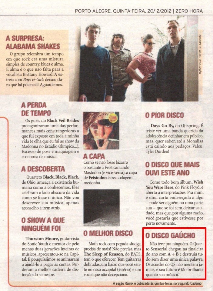 O trabalho inclusive foi eleito o melhor álbum gaúcho de 2012 na coluna Remix do Segundo Caderno de ZH.