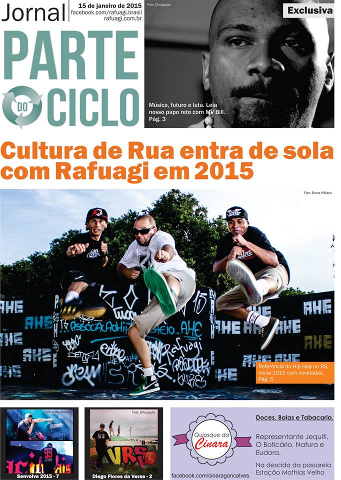 Já está circulando pelas ruas de Porto Alegre e Região Metropolitana a primeira edição do jornal Parte do Ciclo – iniciativa do Rafuagi que visa fomentar e fortalecer a cultura Hip Hop independente do Rio Grande do Sul. O impresso é distribuído gratuitamente nas estações do Trensurb, espaços culturais, eventos de música, cultura e gastronomia, escolas públicas, estúdios e projetos sociais. Toda a iniciativa – desde a produção dos conteúdos, design, diagramação e captação dos recursos para impressão – é realizada pelo Grupo Rafuagi, de forma independente. Acesse a edição digital: http://issuu.com/rafuagibrasil/docs/parteciclo_jan2015