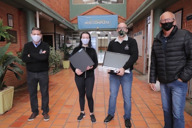 Recentemente, o Colégio Marista Irmão Jaime Biazus recebeu a doação de 90 computadores da PUCRSOs equipamentos estão sendo emprestados para os estudantes que não possuem acesso a aparelhos celulares. Os estudantes recebem um kit contendo mouse, teclado, monitor, desktop e cabo de rede de internet.
